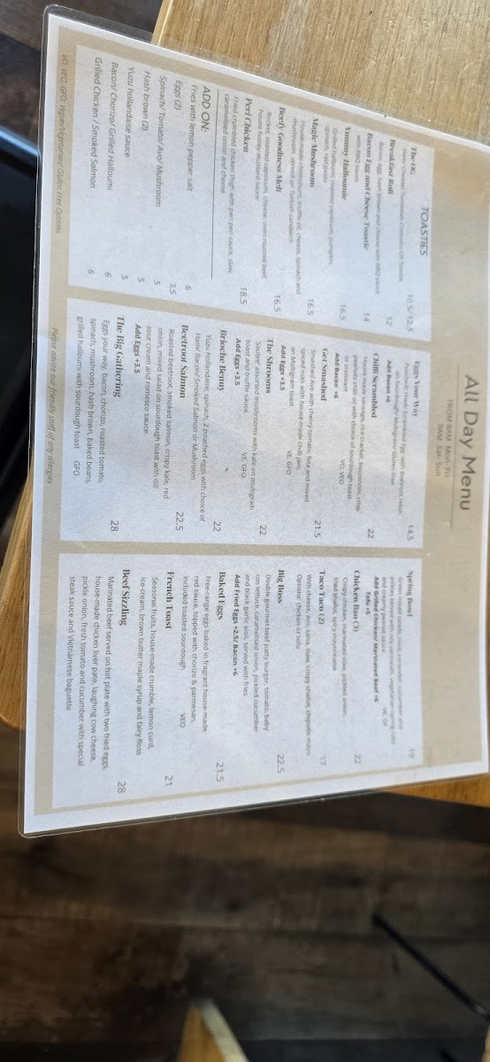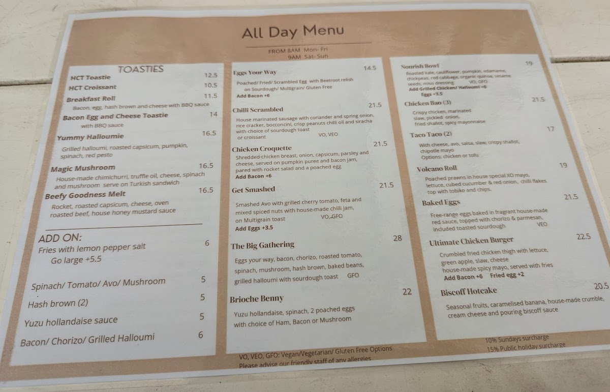 Add-Ons: Extras are available to customize meals, including fries with lemon pepper salt, additional eggs, vegetables like spinach and tomato, as well as protein options such as bacon, chorizo, grilled halloumi, grilled chicken, and smoked salmon. Sauces like yuzu hollandaise are also offered to complement dishes.
